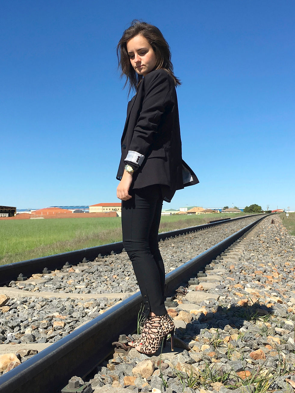 Blazer (Stradivarius), camisa (Bershka), pantalón (Zara), camiseta interior de encaje (Zara), zapatos (Zara), bolso (Paco Martinez), reloj dorado (Precio:15€), collar (Precio 8€).